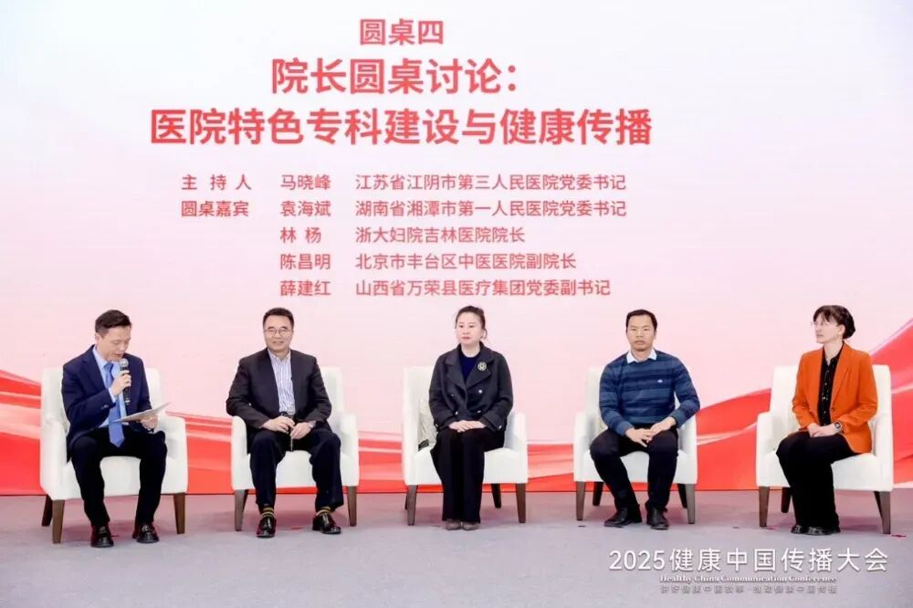 ldquo;医院特色专科建设与健康传播”是推动公立医院高质量发展、落实健康中国战略的关键实践。特色专科是医院发展的核心竞争力,健康传播则是连接优质医疗资源与群众健康需求的桥梁。12月6日下午,2025健康中国传播大会平行会议——“科技赋能与健康传播双轮驱动下的健康中国建设会议”在北京国家会议中心成功举办,第四场院长圆桌会议正是围绕“医院特色专科建设与健康传播”的主题,江苏省江阴市第三人民医院党委书记马晓峰作为主持人,湖南省湘潭市第一人民医院党委书记袁海斌、浙大妇院吉林医院院长林杨、北京市丰台区中医医院副院长陈昌明、山西省万荣县医疗集团党委副书记薛建红就专科建设与健康传播的融合发展展开讨论。