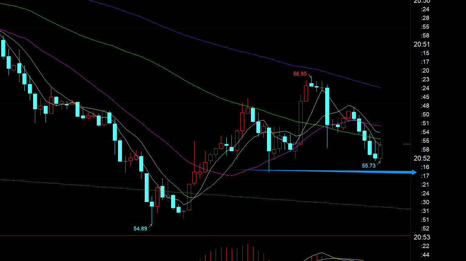 原油方面:下行通道下轨支撑55.3稳住反弹了一波,本来昨日收盘前继续拉升,日线收报饱满阳K,今日亚盘应该会往上至少惯性反弹一波,但并未出现,反而是震荡下滑;所以短线它陷入了小范围震荡,今晚留意55.8一线支撑是关键,能形成双底拉升,那么有希望去突破日内高点,朝着通道上轨去试探;若守不住,那么可能反复试探下轨再二次去企稳;