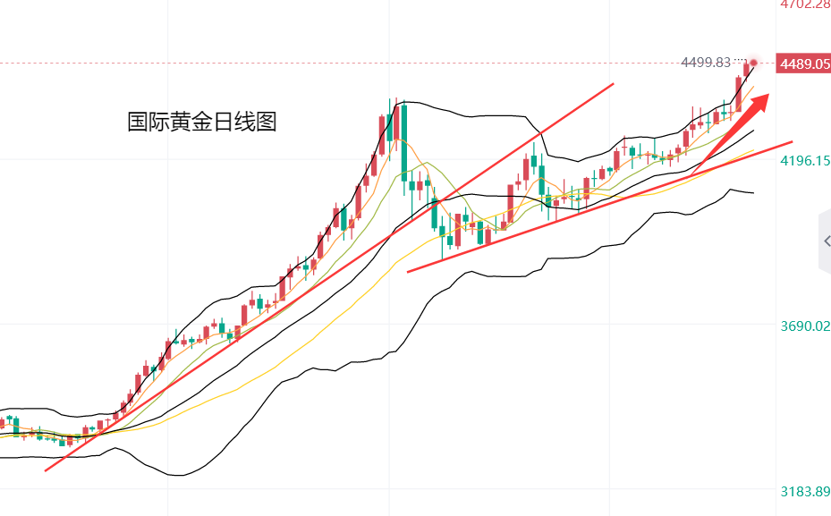 从之后的走势看,昨日周二亚盘开盘后,黄金直接站稳4450美元继续上涨,至4497美元遇阻,此后亚欧盘金价多次向上试探,均未能突破4500美元整数位置附近压制,美盘开盘后,黄金再次涨至4497美元遇阻后,走势短线跳水,刷新日低至4430美元,不过金价很快企稳反弹,继续向上试探,临近收盘时刷新历史新高至4499美元。总体来看,黄金在突破周一高点4449美元后,向上试探4500美元整数位置遇阻,基本符合我们预期。