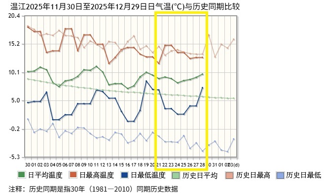 以温江国家气象站为例,冬至开始数九以来的日平均气温一直比常年同期偏高2~3℃。元旦假期,预计日最高气温降至7~9℃,跟常年1月上旬持平;日最低气温降至5℃左右,高于1月上旬平均日最低气温。