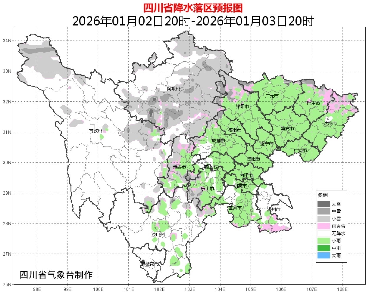 元旦晚上到1月2日白天,盆地大部阴天有小雨或零星小雨,高海拔山区有雨夹雪或小雪,局地中雪;川西高原大部多云间晴,局部地方多云间阴有阵雪或阵雨;凉山州大部阴天间多云,东北部有阵雪或阵雨,攀枝花市晴间多云。