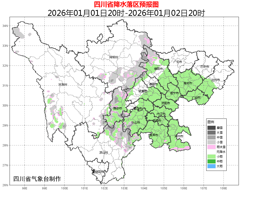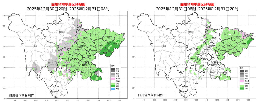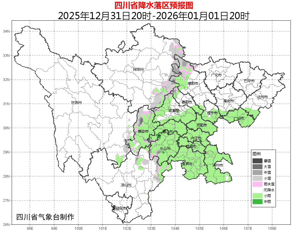 12月31日晚上到2026年元旦白天,盆地大部阴天,西南部、南部、中部及西北部沿山有小雨,高海拔山区有雨夹雪或小雪,局地中雪;甘孜、阿坝两州东部和凉山州东北部阴天间多云有分散阵雪或阵雨,川西高原和攀西地区的其余地方多云间晴。