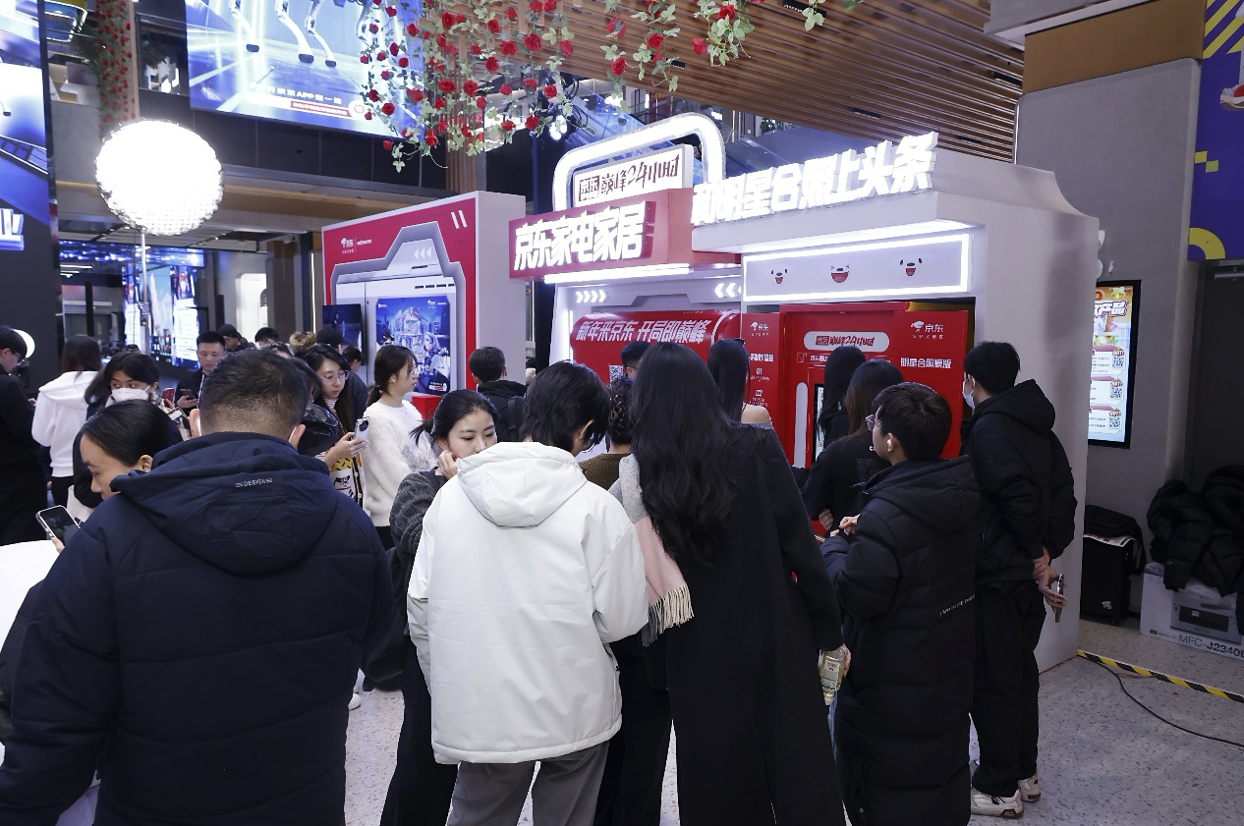 活动现场,“新年头条”自助拍报机前聚集了不少拍照打卡的顾客。大家轮番与刘宇宁、张艺兴、华晨宇等明星“跨时空同框”,一键生成专属新年封面,并分享至社交平台。恰逢宇树科技首家线下门店在京东MALL北京双井店开启试营业,自助拍报机前还有机器人引导过往行人参与活动、互动交流,吸引了众多家庭和科技爱好者驻足。