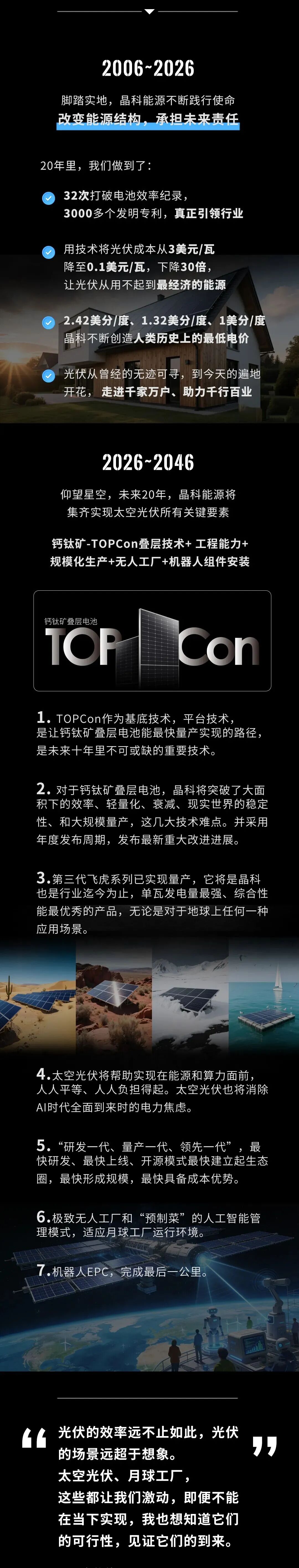 2026~2046,仰望星空,未来20年,晶科能源将集齐实现太空光伏所有关键要素: