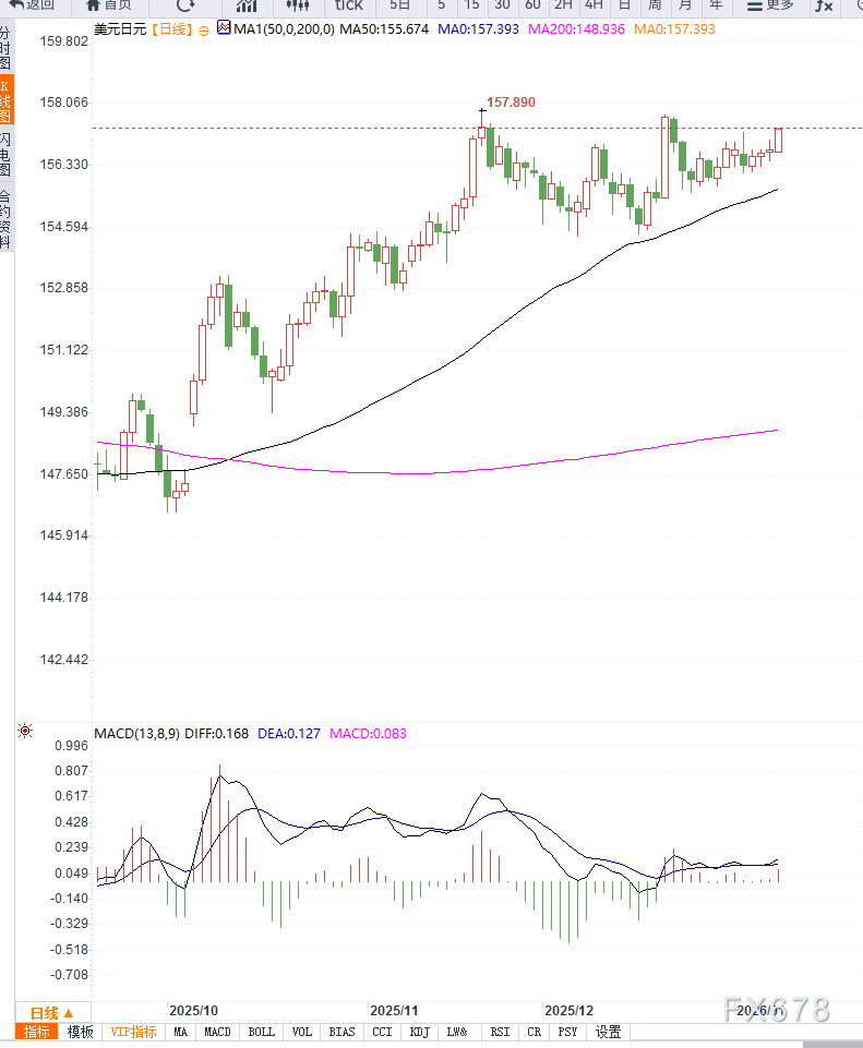 从日线结构来看,美元兑日元维持震荡偏强格局。汇价持续运行在主要均线系统之上,显示中期趋势仍偏向多头。近期价格回升并测试157.30附近区域,表明多头动能尚未完全衰竭。