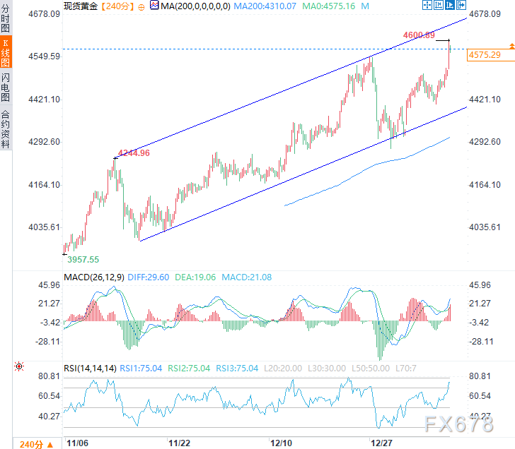 周一(1月12日)亚欧时段,现货黄金震荡上涨,延续了前两个交易日涨势,日内一度触及4600.89美元/盎司的历史新高,现交投于4575美元/盎司附近,日内涨幅约1.45%。