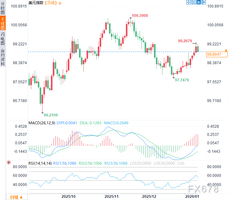 周一(1月12日)亚欧时段,美元指数震荡下行,日内跌幅约0.2%,从前一交易日触及的一个月高点(99.27)回落,现交投于98.90附近,因特朗普发起刑事调查,威胁鲍威尔,市场对美联储独立性担忧加剧,进而对美元信用产生怀疑情绪。