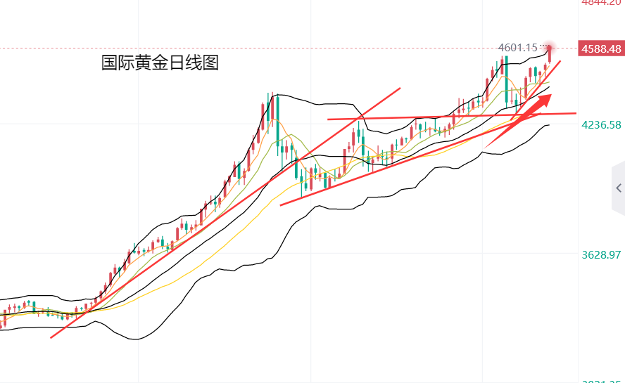 从之后的走势看,上周五欧盘盘中,黄金继续保持4460到4480美元区间,高位横盘震荡,美盘开盘后,黄金向上突破,涨至4517美元遇阻,回落4482美元企稳后,黄金在收盘时回升至4511美元;本周一开盘,黄金跳空高开,回落4513美元企稳后,走势一路上扬,刷新历史新高至4601美元,回落4561美元企稳后,再度涨至4599美元遇阻,目前交投于4590美元。总体来看,黄金突破上涨,再创历史新高,符合我们整体看涨的预期。