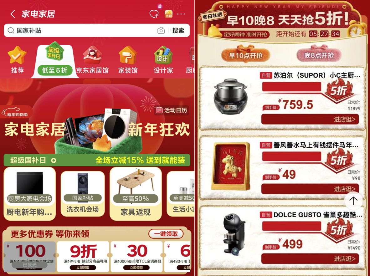 岁末迎新之际,京东家电家居超级补贴日重磅来袭,海量家电家居好物全场立减15%,送到就能装,让品质生活轻松入户。1月12日20点起,打开京东APP搜索“家电家居超级补贴日”或“家电家居新年购物季”,即可一键直达活动会场,更有5折好物放送,从客厅的视听盛宴到卧室的安稳睡眠,从厨房的烹饪乐趣到浴室的焕然一新,一键打造理想中的家。