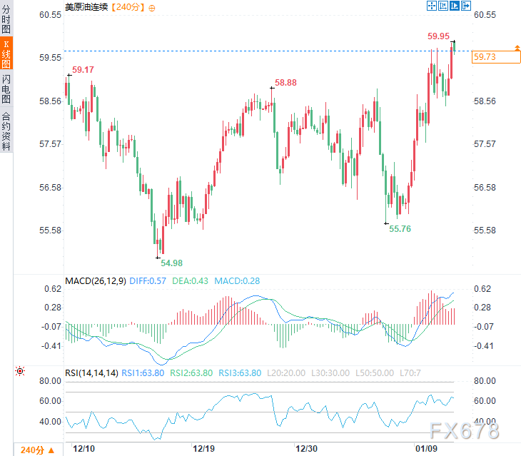 周二亚市时段,美原油价格震荡上行,日内涨幅约0.4%,一度触及59.95美元/桶的近一个月高点,油价此前已经连续三个交易日上涨,累计涨幅约6%。