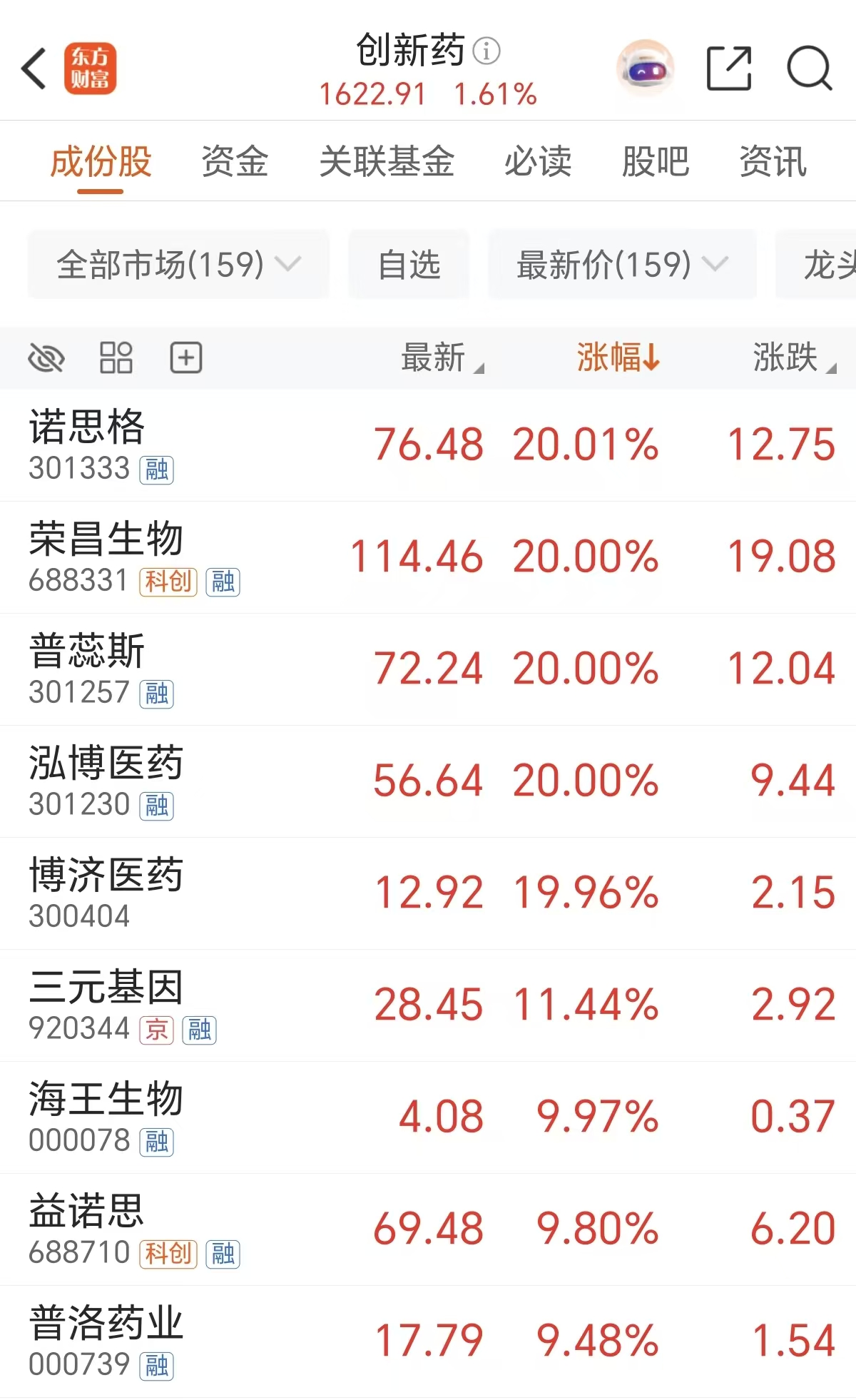 周二(1月13日)创新药概念大涨近2%,多只个股表现强势,诺思格、荣昌生物、普蕊斯、泓博医药等多股20CM涨停,三元基因等涨超10%。