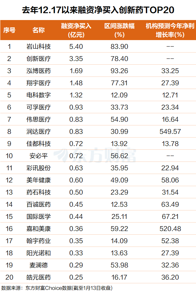 具体来看,岩山科技排名第一,融资净买入5.4亿元,期间涨幅高达84%;创新医疗排名第二,融资净买入3.4亿元,期间涨幅超78%。