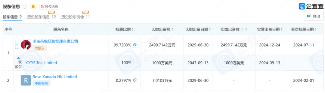 同年7月,湖南茶悦文化新增湖南茶悦品牌管理有限公司为股东,该公司法定代表人为茶颜悦色创始人吕良,注册资本1000万美元,由注册于香港的CYYS Tea Limited全资持股。