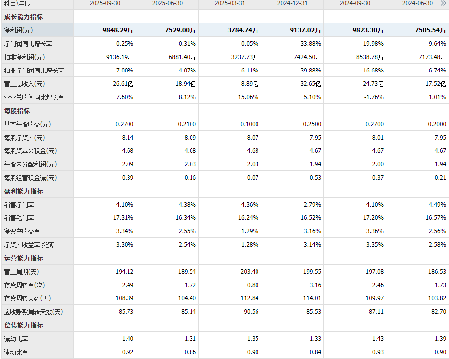 公司此前披露2025年第三季度报告,前三季度公司整体经营稳健,实现营业总收入26.61亿元,同比增长7.60%;归母净利润9848.29万元,同比增长0.25%。
