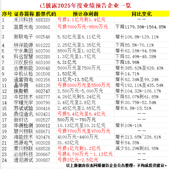 近期,A股上市公司2025年年报业绩预告正进入加速披露期。仪表网统计显示,截至1月27日已有24家A股上市仪器仪表公司对外披露2025年业绩预告,其中16家净利润预喜,8家预亏。