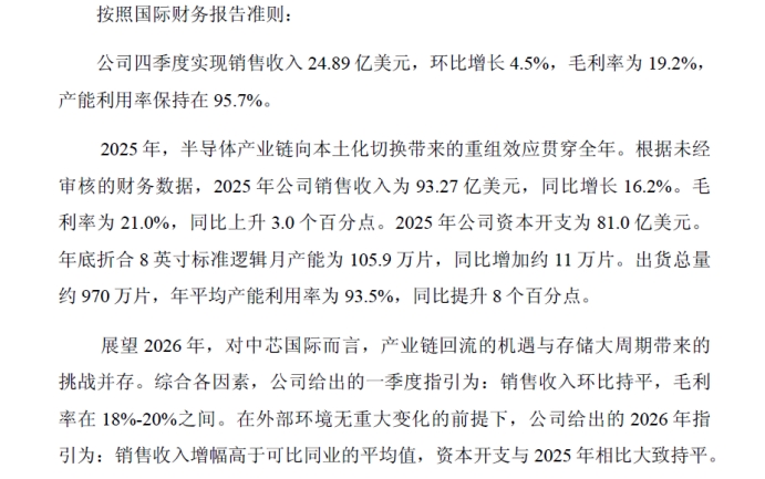 中芯国际同时发布2026年指引:在外部环境无重大变化的前提下,预计2026年销售收入增幅高于可比同业的平均值,资本开支与2025 年相比大致持平;一季度指引为销售收入环比持平,毛利率在18%-20%之间。