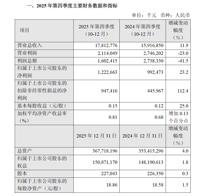 公司称,2025 年第四季度利润总额较上年同期减少,主要是由于本季度财务费用上升及投资收益下降所致。2025 年第四季度归属于上市公司股东的扣除非经常性损益的净利润较上年同期增加,主要是由于本季度晶圆销售量增加、产能利用率上升及产品组合变动所致。