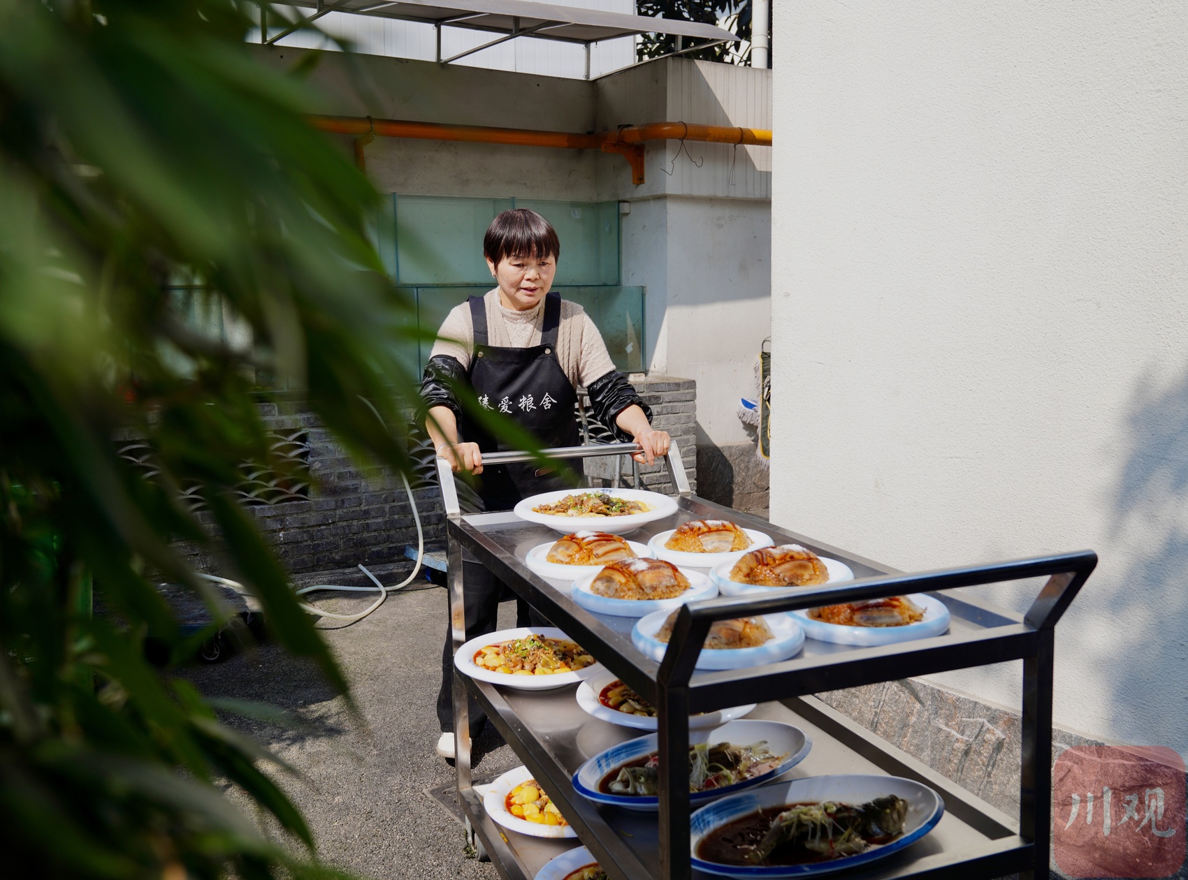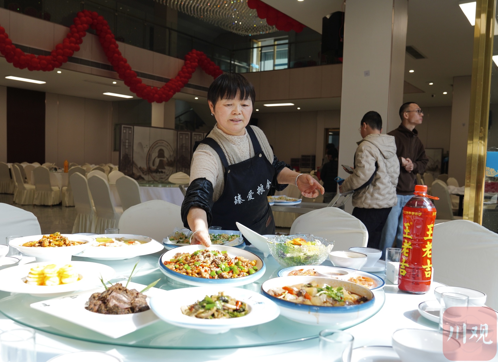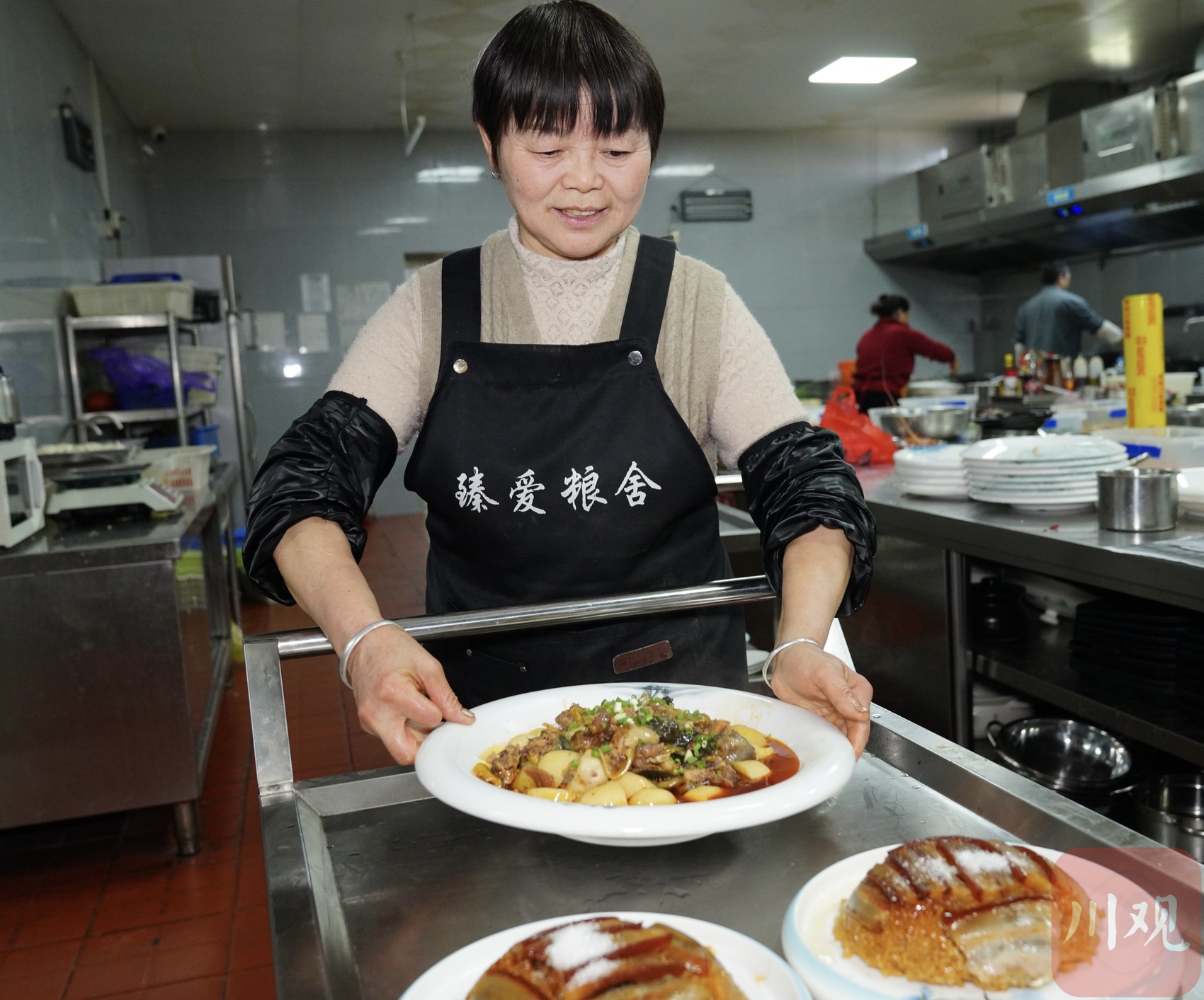 2026年2月20日,在成都市双流区黄水镇一家餐厅,周玉芳把菜品端上桌。