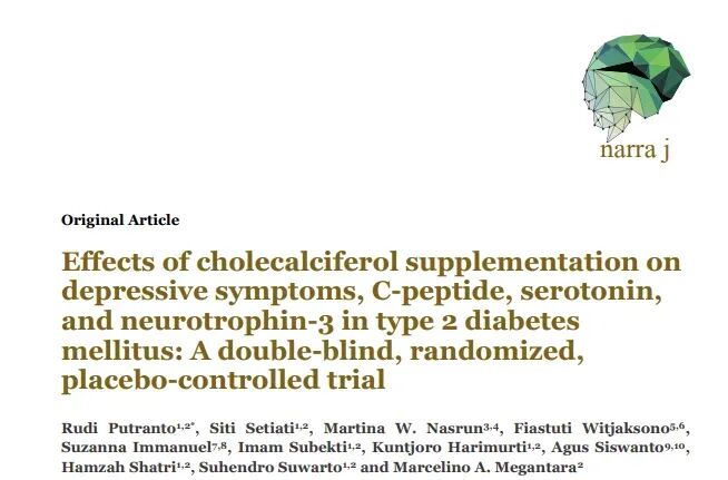 utranto R, Setiati S, Nasrun MW, Witjaksono F, Immanuel S, Subekti I, Harimurti K, Siswanto A, Shatri H, Suwarto S, Megantara MA. Effects of cholecalciferol supplementation on depressive symptoms, C-peptide, serotonin, and neurotrophin-3 in type 2 diabetes mellitus: A double-blind,randomized, placebo-controlled trial. Narra J. 2024 Dec;4(3):e1342. doi: 10.52225/narra.v4i3.1342. Epub 2024 Oct 30. PMID: 39816051; PMCID: PMC11731796.
