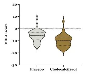 图2:小提琴图:展示安慰剂组与胆钙化醇(维生素D₃)组的贝克抑郁自评量表第二版(BDI-II)得分变化值(delta score)