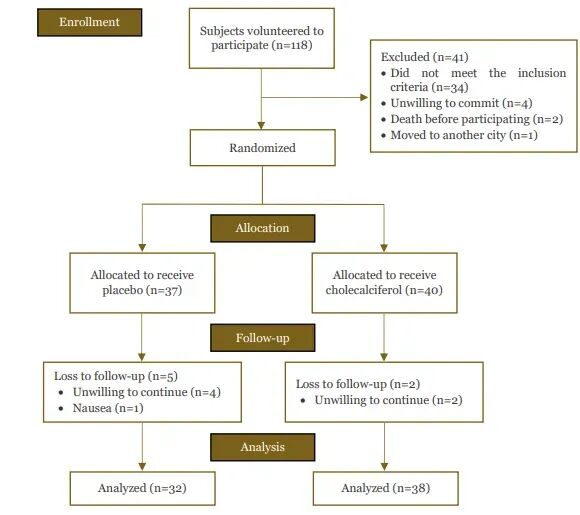 本研究是一项单中心、双盲、随机、安慰剂对照试验,旨在评估12周高剂量胆钙化醇对T2DM合并轻-中度抑郁患者的情绪及潜在机制分子的影响。2021年4月至2022年9月,研究团队于印尼Cipto Mangunkusumo医院连续招募118例受试者,经筛除严重抑郁、肝肾功能异常、近3月服维D等41例后,最终77例入组;按区组随机分为cholecalciferol组(n=40,每日4000 IU)与外观一致的乳糖安慰剂组(n=37)。干预期间所有患者维持原降糖方案,不新增抗抑郁药。