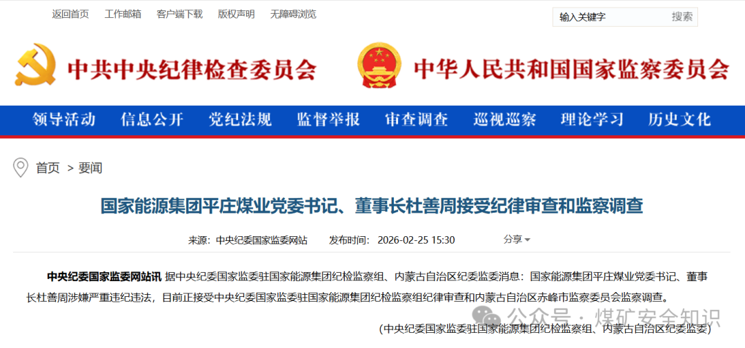 2026年2月,杜善周涉嫌严重违纪违法,接受中央纪委国家监委驻国家能源集团纪检监察组纪律审查和内蒙古自治区赤峰市监察委员会监察调查。(来源:中央纪委国家监委网站)