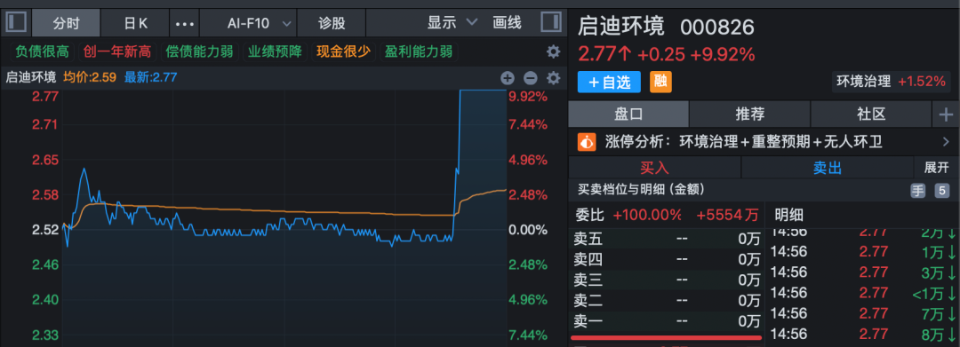 市场热点方面,环保概念股尾盘出现放量抢筹现象,板块指数在最后半小时放量拉升创5年半新高。中科环保(301175)在下午两点半后仅约4分钟时间垂直20%涨停,启迪环境也仅用约5分钟从下跌状态直线拉直涨停,新安洁、永清环保、蒙草生态等尾盘也纷纷出现异动拉升走势。