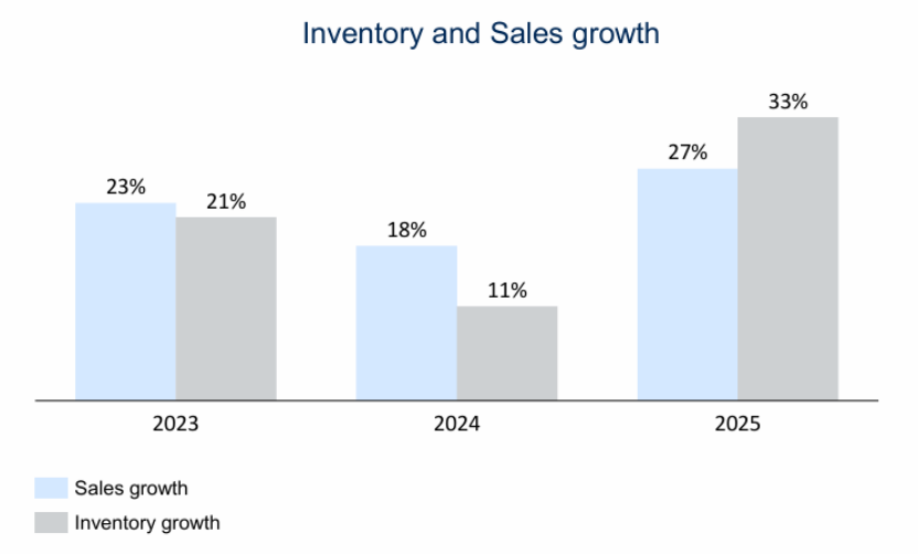 数据显示,2023-2025年,亚玛芬的销售收入增速与库存增速分别为23%/21%、18%/11%、27%/33%。近三年来,集团销售增速首次低于库存增速,并且库存增长首次突破30%。