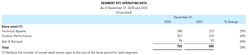门店方面,2025年第四季,萨洛蒙品牌新增39家门店,主要集中在大中华区。2025年全年,品牌所在户外性能板块DTC门店增至331家,超过技术服装板块的288家。