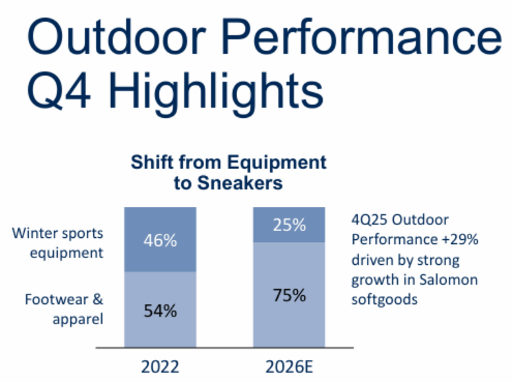 亚玛芬在财报中表示,2025年第四季度,户外性能板块的增长主要由萨洛蒙软商品强劲增长推动。2022年,萨洛蒙冬季运动装备与鞋服商品的比重基本为1:1,公司将增加高潜力软商品比重,预计到2026年,该比例将调整为1:3。