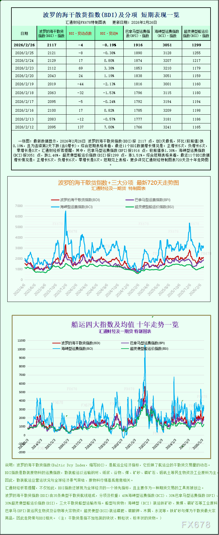 汇通财经APP讯——最新数据显示,2026年2月26日 波罗的海干散货指数(BDI)报 2117 点,创3天最低,环比(较前值)跌0.19%,且为连续第2天下跌(含0增长)。综合短期表格来看,最近11个BDI数据增长情况是:正增长5次,负增长6次,零增长是0次。其中,巴拿马型运费指数(BPI)报1916 点,较前值涨1.38%,海岬型运费指数(BCI)报3051 点,跌2.46%,超灵便型船运价指数(BSI)报1299 点,涨3.51%。波罗的海干散货指数+三大分项的最新720天走势图、十年走势图等详见汇通财经特制图表。