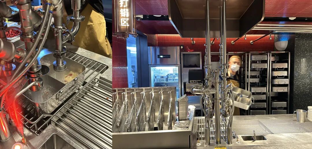打锅区引入智能打锅机,精准控制汤底配比,锅底现场现调、现打、现出;打汤区工作人员通过智能设备现场接汤,过程公开透明。