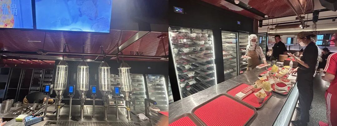 此次海底捞创新概念店,则将 “透明化” 贯彻到底 —— 不仅食材可溯源,出餐流程也全程可见。从菜品出品到锅底调配,均为现场操作、现打现出,整个过程完全置于顾客视线之下。