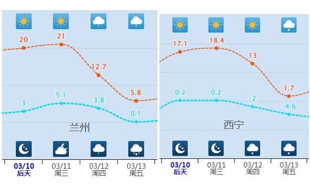 西北地区多地最高气温将从20℃+降至个位数,降温速度快、力度大,前后冷暖反差大。像兰州11日最高气温21℃,13日就降至6℃;西宁11日最高气温18℃,13日跌至2℃。