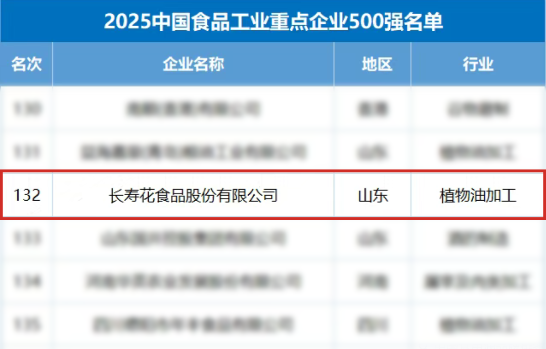近日,“2025全国食品工业科技进步工作会议暨2025中国食品产业发展研究报告发布会”在北京召开,会议首度发布了“2025中国食品工业重点企业500家名录”,其中,共有39家食用油企业入列,长寿花食品凭借稳健的经营实力与行业影响力成功入选,位列第132位。