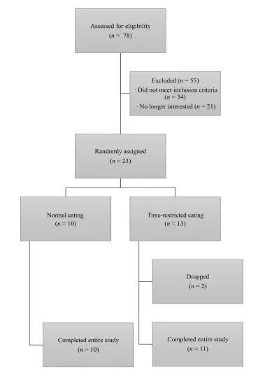 样本纳入与筛选方面,研究者从78名初步筛选者中,严格纳入23名符合标准的受试者:年龄35-60岁,BMI 25.0-34.9 kg/m²,久坐生活方式(无规律有氧或抗阻训练),并经健康史问卷和PAR-Q筛查排除妊娠、吸烟、心血管代谢疾病及影响肌肉的药物使用等禁忌。最终21人完成研究(NE组10人,TRE组11人),女性占比高达85.7%,平均年龄44岁,平均BMI 29.6 kg/m²。