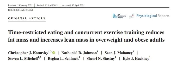 KotarskyCJ, Johnson NR, Mahoney SJ, Mitchell SL, Schimek RL, Stastny SN, Hackney KJ. Time-restricted eating and concurrent exercise training reduces fat mass and increases lean mass in overweight and obese adults.PhysiolRep. 2021 May;9(10):e14868.doi: 10.14814/phy2.14868. PMID: 34042299; PMCID: PMC8157764.
