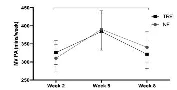 依从性数据为TRE的临床可行性提供了有力背书:TRE组平均进食窗口为7.0±0.8小时,仅2例次违规记录,91%受试者在第4周和第8周报告无不良反应,唯一报告的不良事件为晨间头痛(1例)。抗阻训练依从性达100%,所有受试者完成24次规定训练,中等至剧烈体力活动时间均超过300分钟/周的目标。
