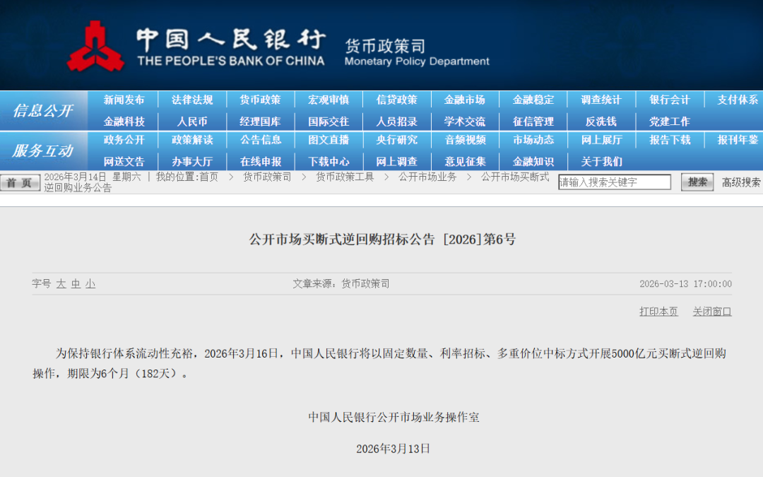 3月13日,央行发布公开市场买断式逆回购招标公告称,为保持银行体系流动性充裕,2026年3月16日,中国人民银行将以固定数量、利率招标、多重价位中标方式开展5000亿元买断式逆回购操作,期限为6个月(182天)。“当月6个月期买断式逆回购到期6000亿元,实现1000亿元流动性净回笼。”中信证券首席经济学家明明分析,3月以来流动性市场整体宽松,1年期同业存单利率在1.55%附近,长端流动性较为充裕。他表示,综合来看,基于削峰填谷的政策模式,当前央行加大流动性供给的必要性并不高,因此3月流动性投放整体呈现稳健操作。招联首席经济学家董希淼表示,春节后,节前取现资金逐步回流,政府债券发行对资金面压力并不大,市场流动性保持相对平稳。因此,央行会综合考虑满足金融市场对中短期资金的需求,又为后续根据市场变化进行灵活操作留下空间。在东方金诚首席宏观分析师王青看来,3月买断式逆回购出现净回笼,不代表央行在收紧中长期流动性,接下来央行将综合运用多种政策工具,保持资金面处于稳定充裕状态。“2026年新增地方政府债务限额已提前下达,这意味着3月政府债券发行规模将继续处于较高水平。另外,2025年10月5000亿元新型政策性金融工具投放完毕,今年3月全国两会政府工作报告中宣布发行8000亿元新型政策性金融工具,主要用于扩投资,这些将继续带动3月配套贷款较大规模投放。”他分析,着眼于应对潜在的流动性收紧态势,央行有必要通过各类政策工具搭配组合,持续向市场注入中长期流动性,引导资金面处于较为稳定的充裕状态。值得提醒的是,公开市场操作只是央行投放流动性的方式之一,中国人民银行注重长短期工具搭配,灵活调节银行体系流动性。2026年以来,央行继续实施适度宽松的货币政策,综合运用多种工具保持流动性充裕。根据央行官网每月公布的工具操作情况,1-2月买断式逆回购、中期借贷便利(MLF)、国债买卖操作分别净投放9000亿元、1万亿元和1500亿元,再加上新型政策性金融工具等结构性工具,已净投放的中长期资金约2万亿元,为年初的信贷“开门红”、政府债券发行以及金融市场的平稳跨节,创造了良好的货币金融环境。业内专家表示,由于居民春节前提取的现金在节后陆续存回银行,增加银行的可用资金,同时3月作为季末月,财政支出力度较大,两会期间地方债发行通常也有所放缓,减少了银行的资金消耗,央行货币政策操作也会有灵活精准的调整,根据流动性和市场运行情况,合理搭配工具品种,做好流动性调控,支持金融市场平稳健康发展。“近年来我国进一步向价格型货币政策调控框架转变,公开市场操作量更多是服务于利率调控目标,未来也不用过多关注。”业内专家表示,从货币市场运行情况看,今年以来,隔夜资金利率(DR001)低位运行,均值约为1.33%,比央行政策利率低7个基点,货币金融环境是相对宽松的。此外,公开市场操作规模除了受货币政策立场影响外,还受到财政收支、居民缴税和节假日提现等季节性因素的影响,也不宜简单通过公开市场操作,尤其是某一项公开市场操作的数量变动来判断货币政策是否转向。