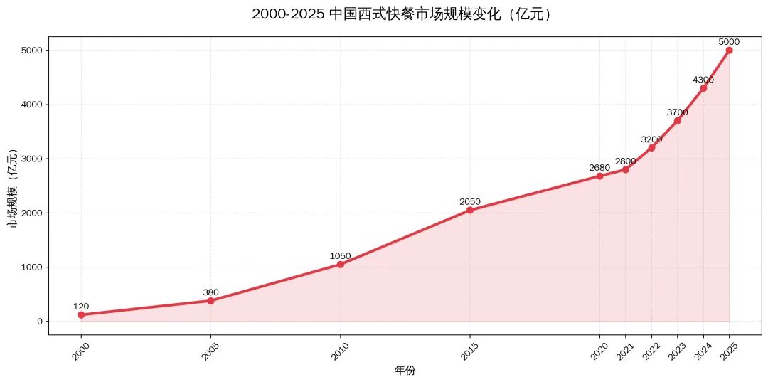 而西式快餐的市场规模,也从2000年的100亿左右,一路狂飙到如今超5000亿,并且仍在保持稳定增长。