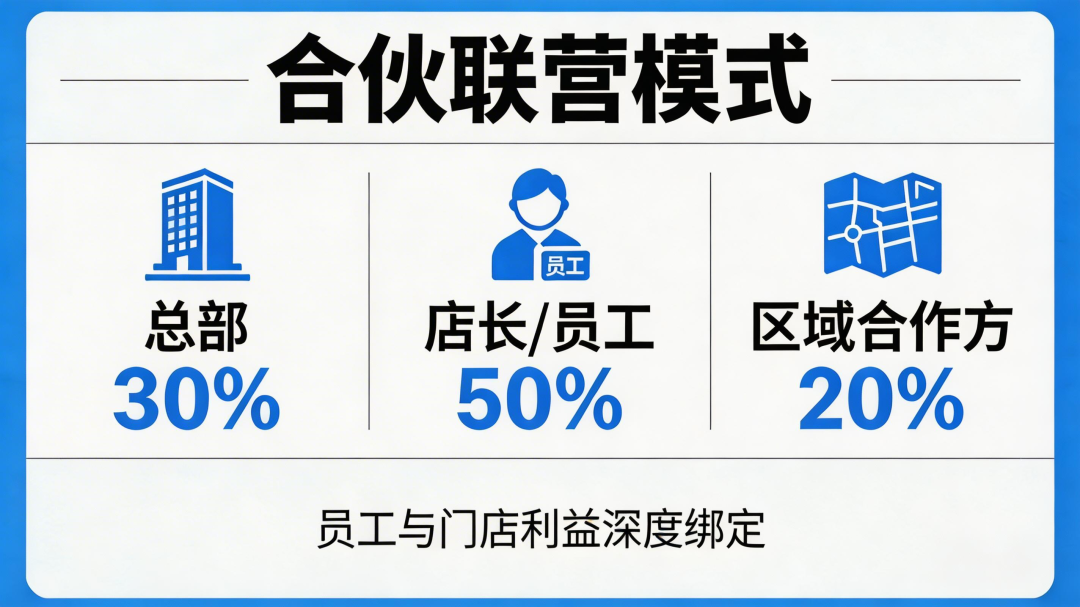 其一是合伙联营模式,将新店股权拆分,总部30%+店长/员工50%+区域合作方20%,员工与门店利益深度绑定。