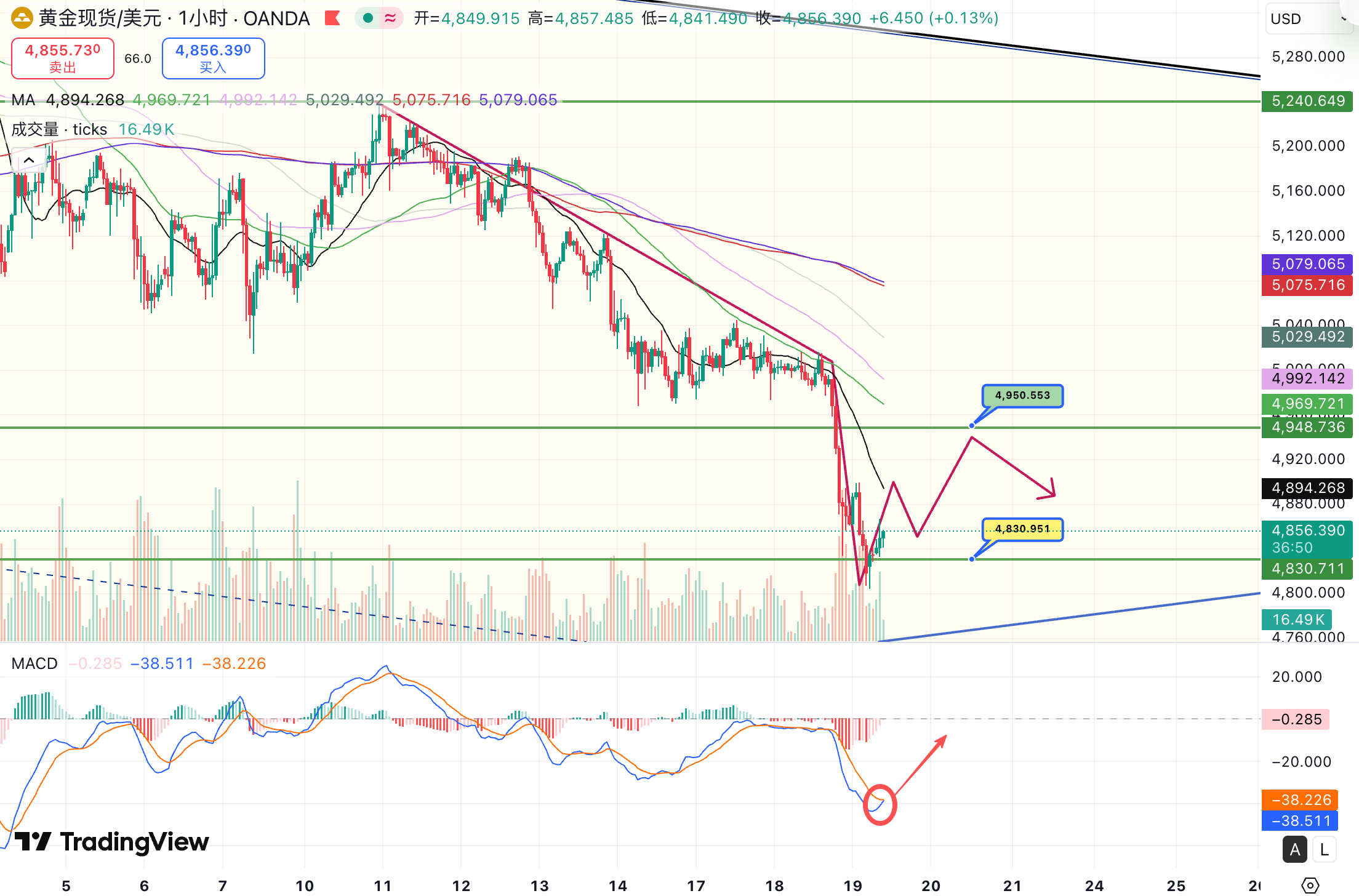 从盘面结构来看,原本关注的4840–4830支撑并未第一时间生效,而是在今日早盘才逐步出现承接力量,价格自该区间展开反弹。结合1小时级别来看,MACD自超卖区域回升,同时成交量出现扩张,短线技术面已具备反弹基础,上方首先关注4890一线压力。