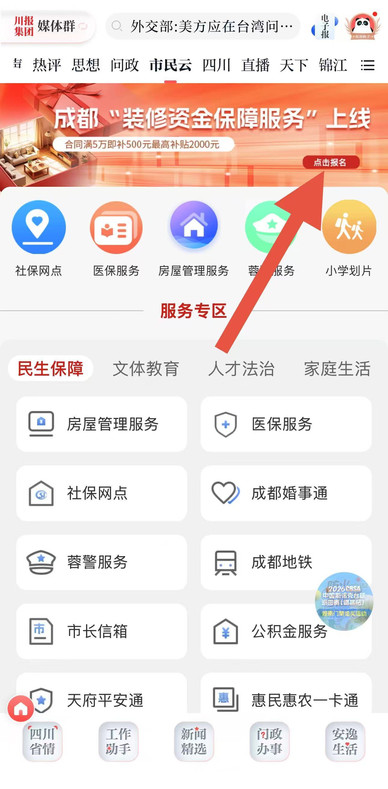 打开川观新闻客户端—天府市民云频道,顶端幻灯区点击进入报名。