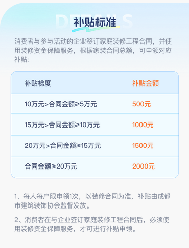 目前,本次活动提供阶梯式现金补贴,根据装修合同金额分档发放,具体如下: