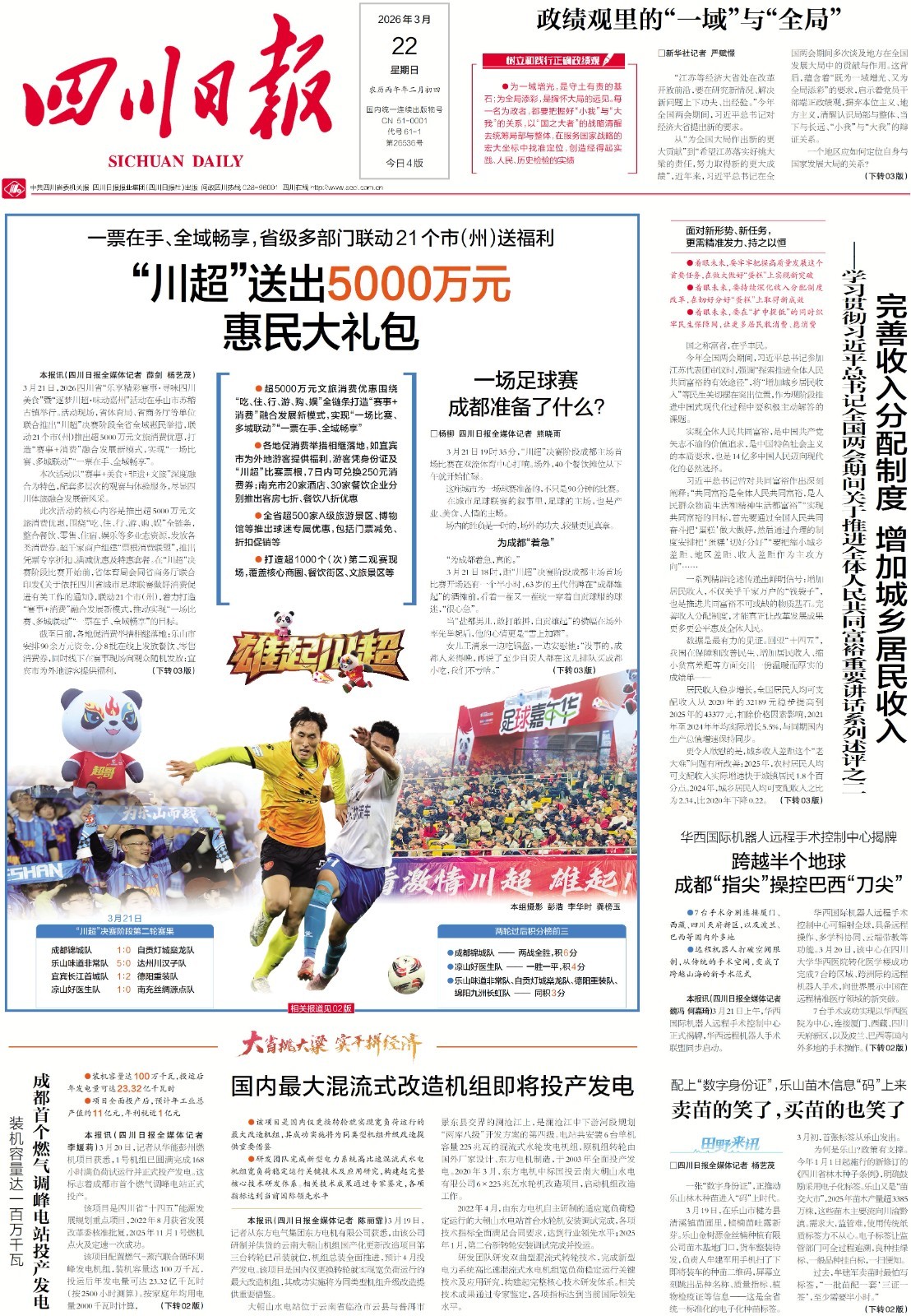 赛场之外,全省21市州联动送出超5000万元文旅消费大礼包,真正实现“一票在手、全域畅享”。凭“川超”票根,你可解锁全链条福利:超千家商户组建票根联盟,吃、住、游、购、娱全覆盖;500余家A级景区、博物馆推出球迷门票减免;全省还打造了千余个第二观赛现场,免费高清直播,让你不在球场也能感受足球嘉年华。赛事、美食、文旅深度融合,这波惠民红利千万别错过!详情请看今日一、二版。