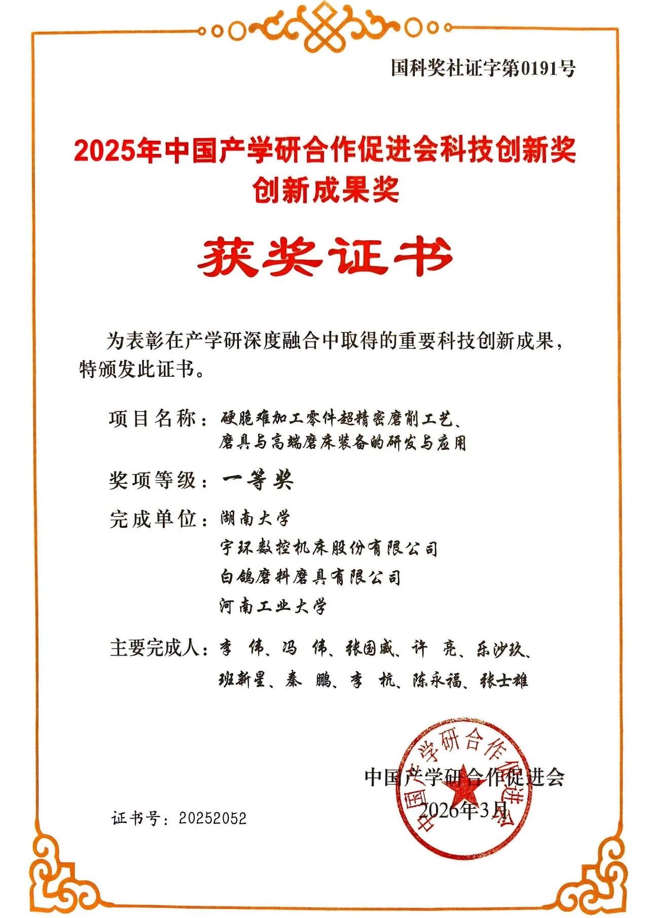 近日,2025年中国产学研合作促进会科技创新奖评选结果正式揭晓,宇环数控作为核心企业参与的“硬脆难加工零件超精密磨削工艺、磨具与高端磨床装备的研发与应用”项目凭借突出的技术创新、显著的产业价值及深厚的产学研协同成效,荣获创新成果奖一等奖。