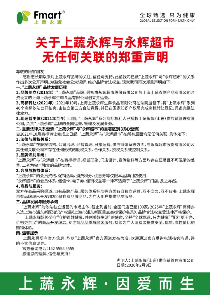 值得注意的是,自2021年10月商标转让完成之日起,“上蔬永辉”与“永辉超市”在所有层面均无任何关联,“上蔬永辉”在股权结构、公司治理、经营管理、日常运营、供应链体系等方面,与永辉超市股份有限公司及其任何关联公司不存在任何形式的股权关系、合作关系、授权关系或控制关系。
