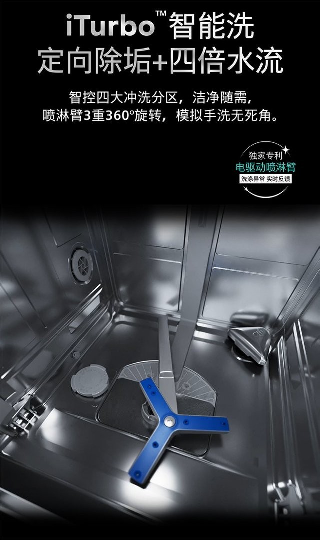 iTurbo智能洗以“定向除垢,AI智能分区”为核心理念,通过智控四大冲洗分区,配合喷淋臂三重360°立体无阻旋转,实现对餐具表面与边角区域的立体覆盖,模拟手洗路径进行无死角冲刷。同时,独家专利电驱动喷淋臂可在运行过程中实时反馈洗涤异常状态,使清洁过程更加稳定可控。