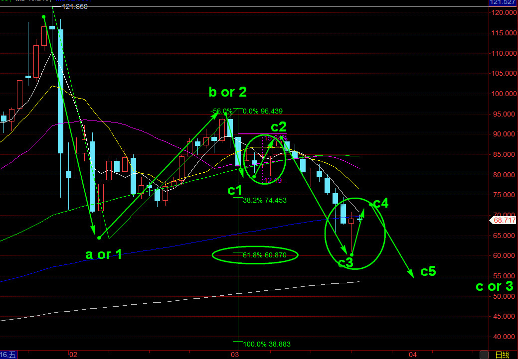 白银本周看60支撑C4反弹,图中的0.618位置附近,昨天提及72压力跌一次,然后74.50承压还看回落,昨天最高70.75回落到68了,空头短线减持压损70.75略上,后面的话就是次低点64支撑做多做好对应风控,上方进一步就是10日均线测试做空看回落。