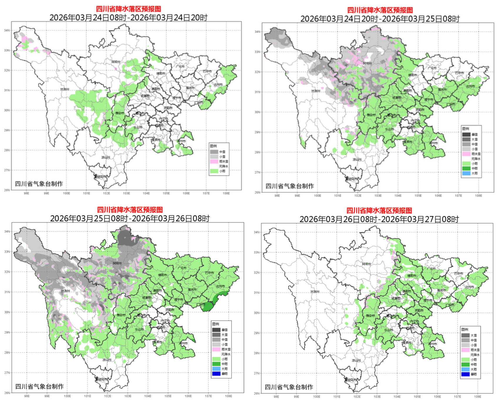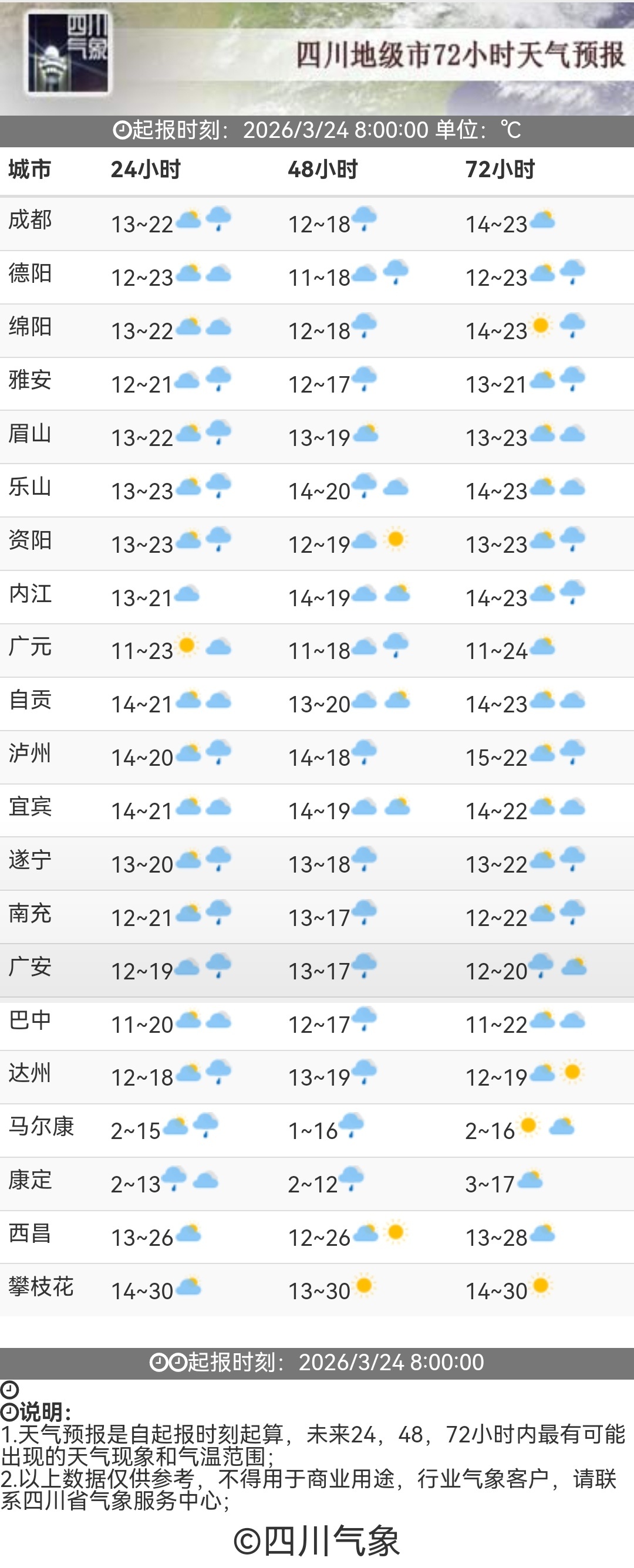 预计今天(3月24日)白天到晚上,盆地各市多云间阴,部分地方早晚有小雨或阵雨;阿坝州大部、甘孜州北部东部和凉山州北部阴天间多云有阵雨(雪)或雷雨,局地有中到大雪,川西高原和攀西地区其余地方多云间晴。